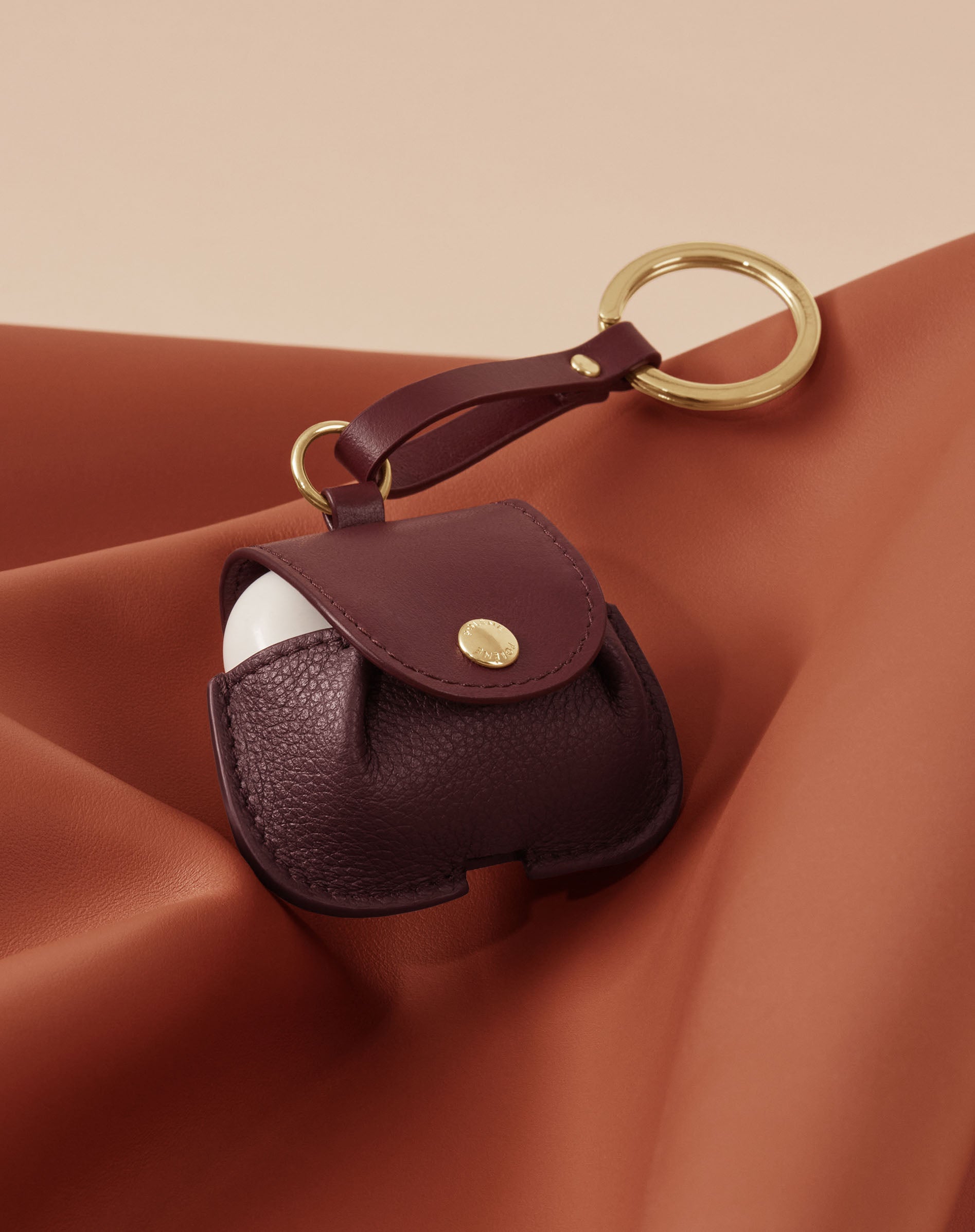 'Numéro Un(누메로 앙)' 에어팟 케이스에는 하우스의 아이코닉한 특징이 오롯이 담겨있습니다. 손 바느질로 양쪽 끝을 고정시켜 구현한 드레이프와 반달 모양의 덮개, Polène가 새겨진 스냅단추와 열쇠고리로 이루어져 있습니다.