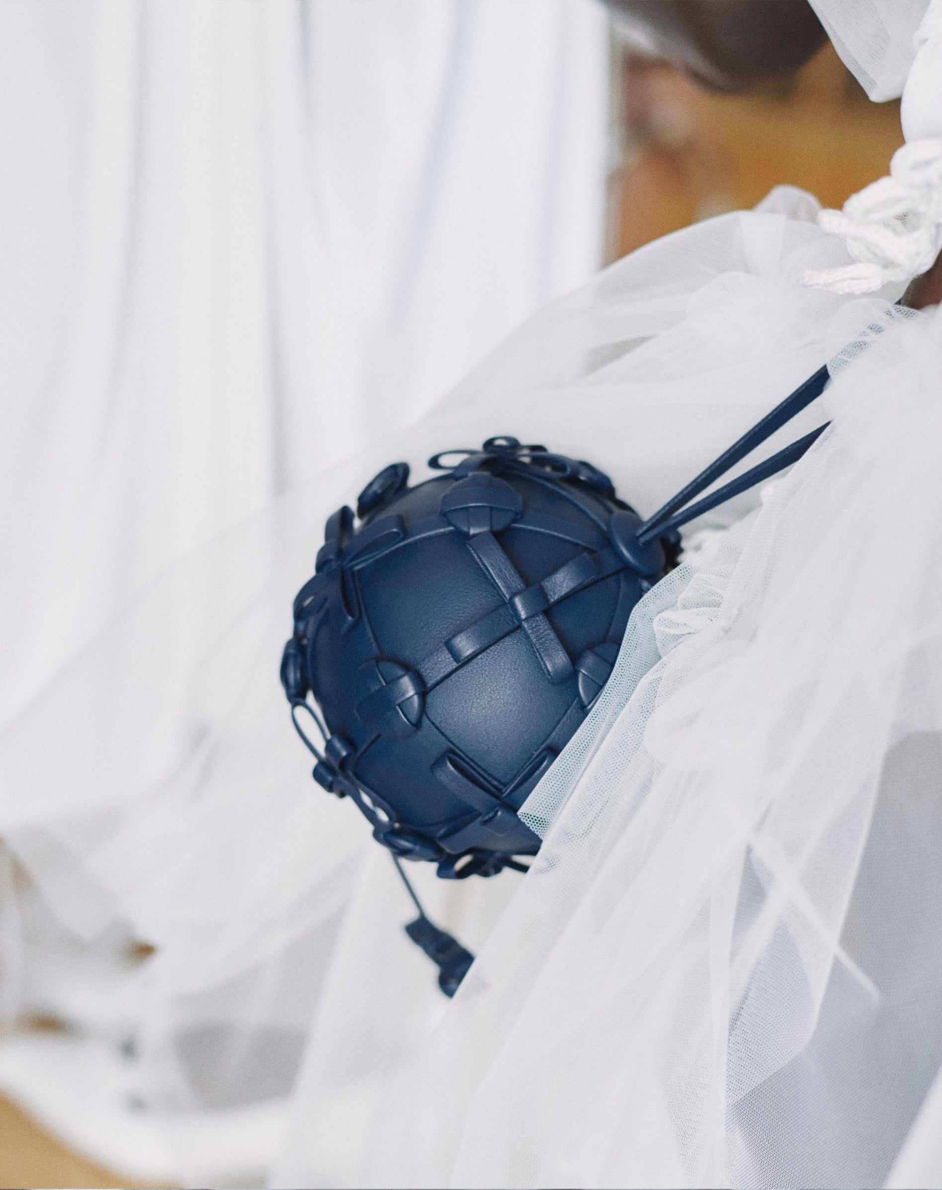 스페인 우브리케 공방에서 이루어진 두 브랜드 간의 감각적 시너지는 조화로운 디자인이 돋보이는 두 가지 모델의 탄생으로 이어졌습니다. '버튼 보우 박스'와 '버튼 보우 스피어'에서는 장인의 손길로 하나씩 수를 놓듯 완성한 버튼과 리본 디테일이 섬세한 격자무늬를 이루며, 로이신 피어스의 독창적 작품 세계를 고스란히 반영합니다.