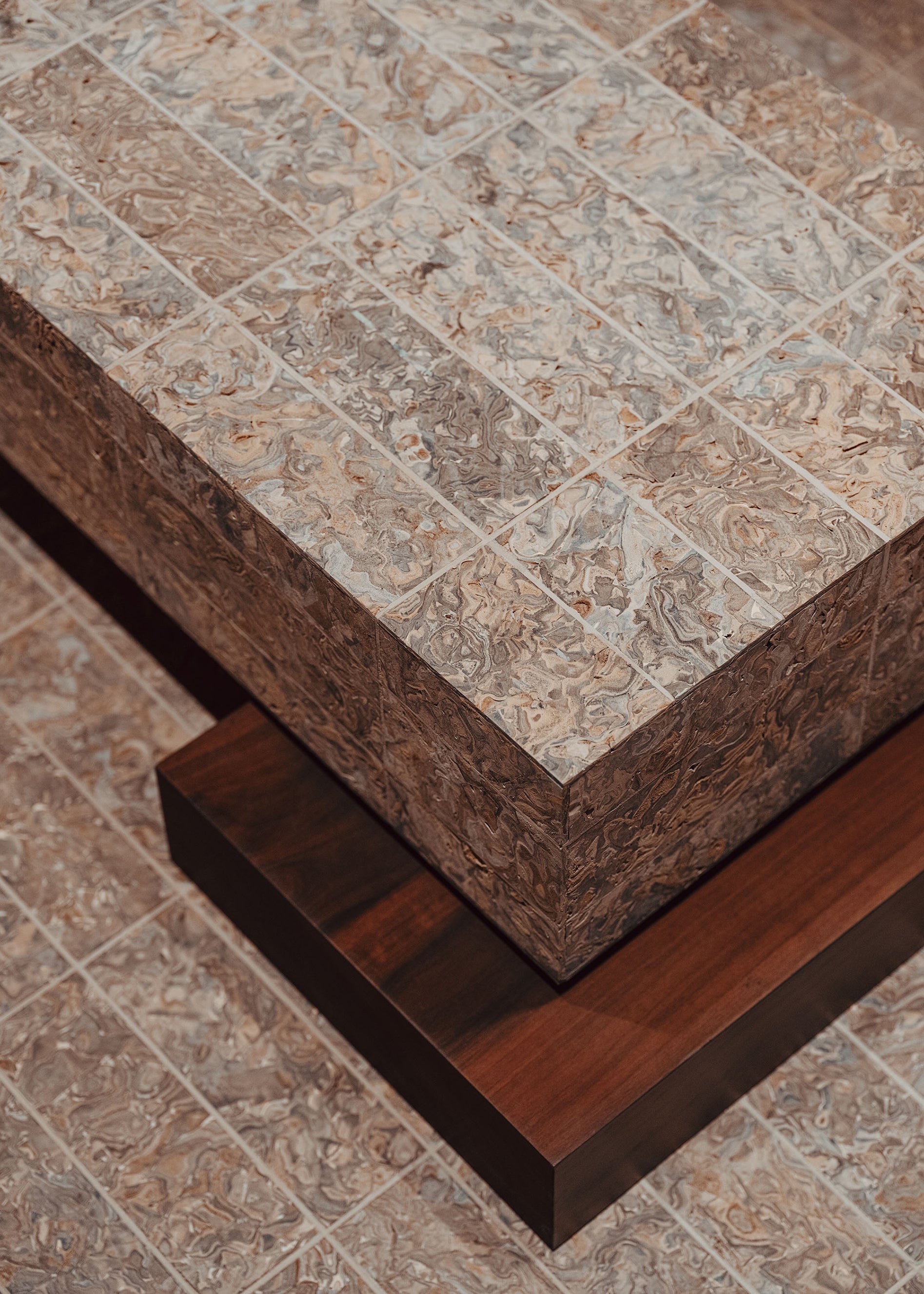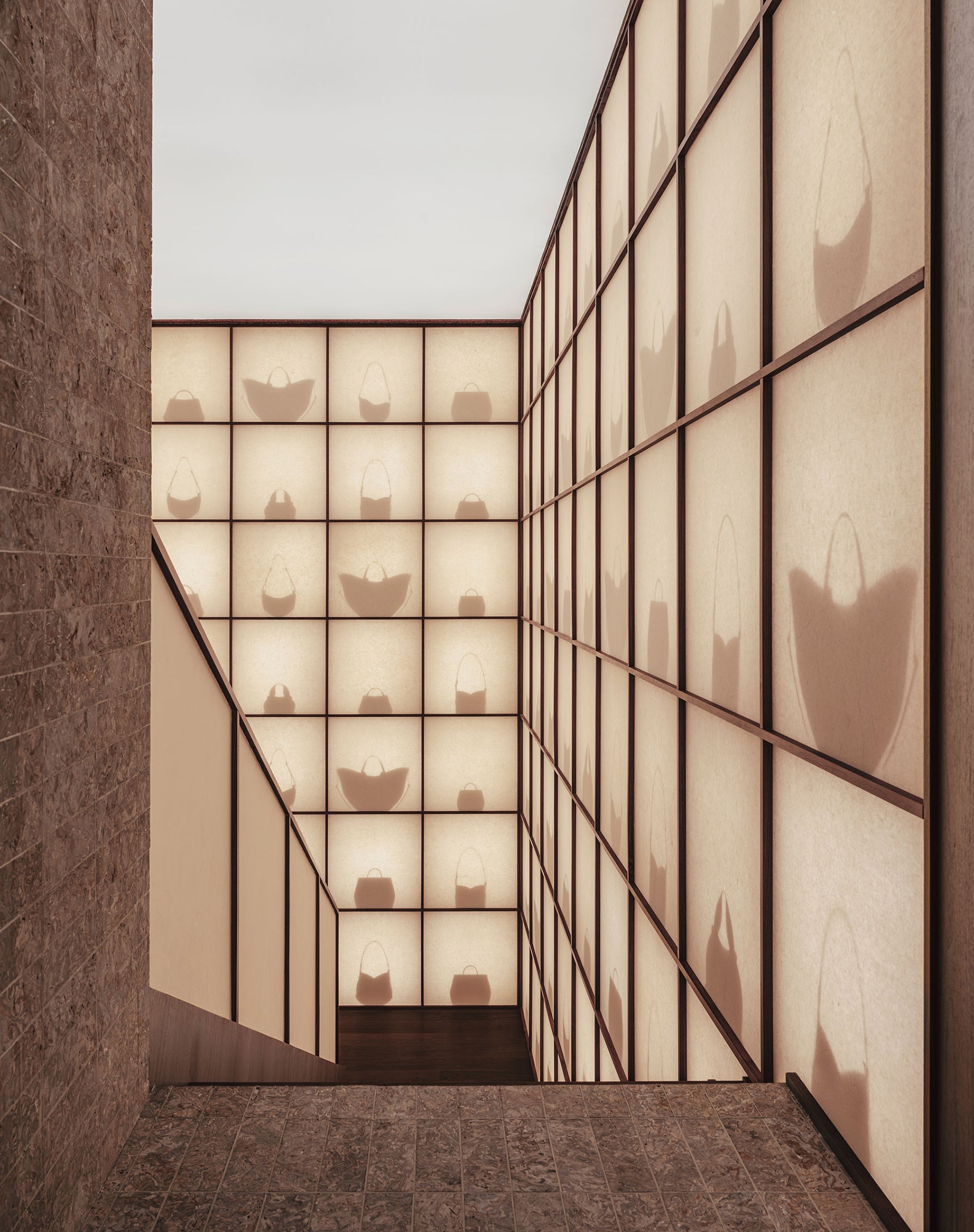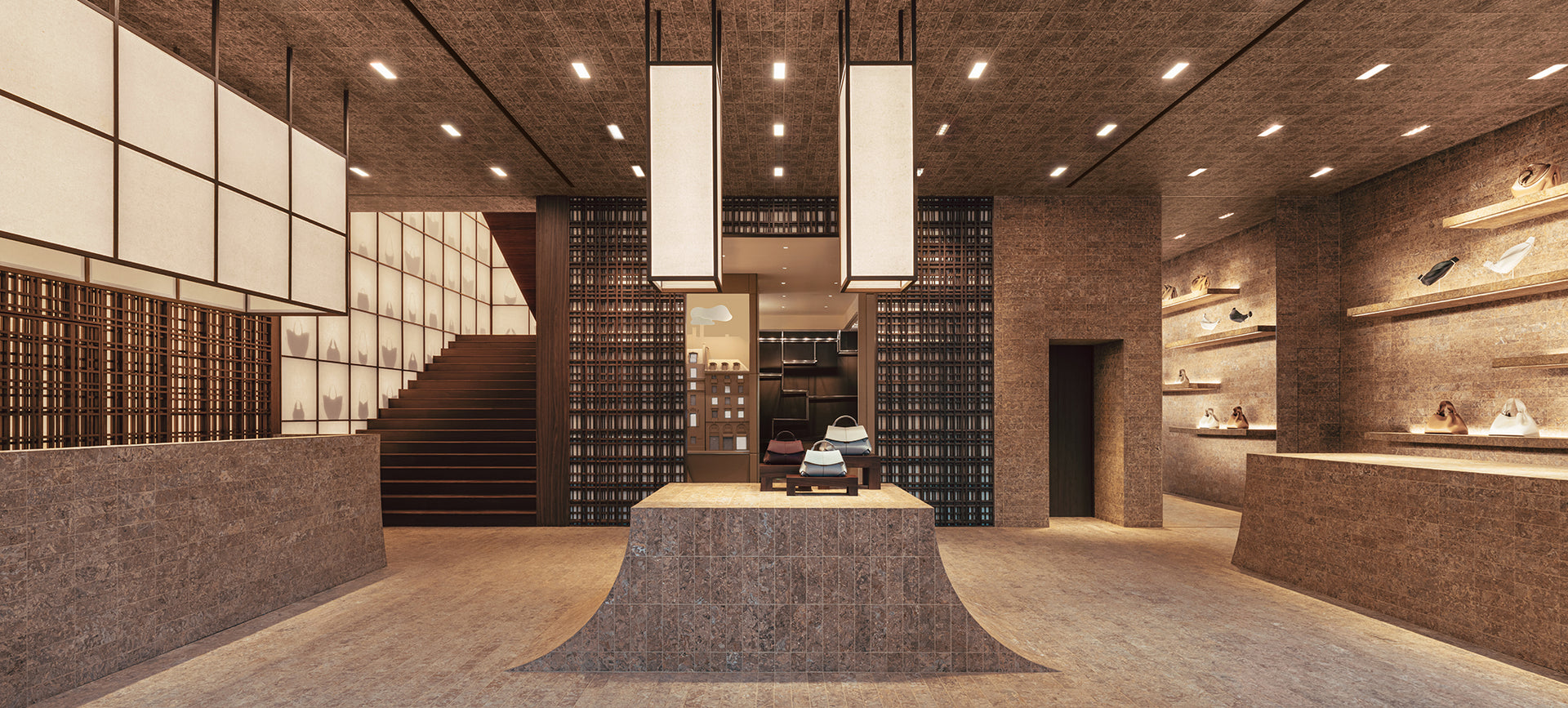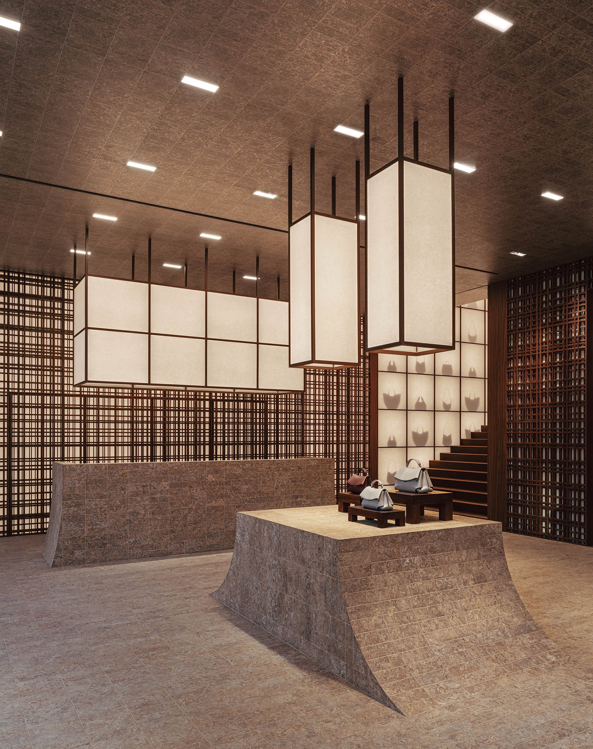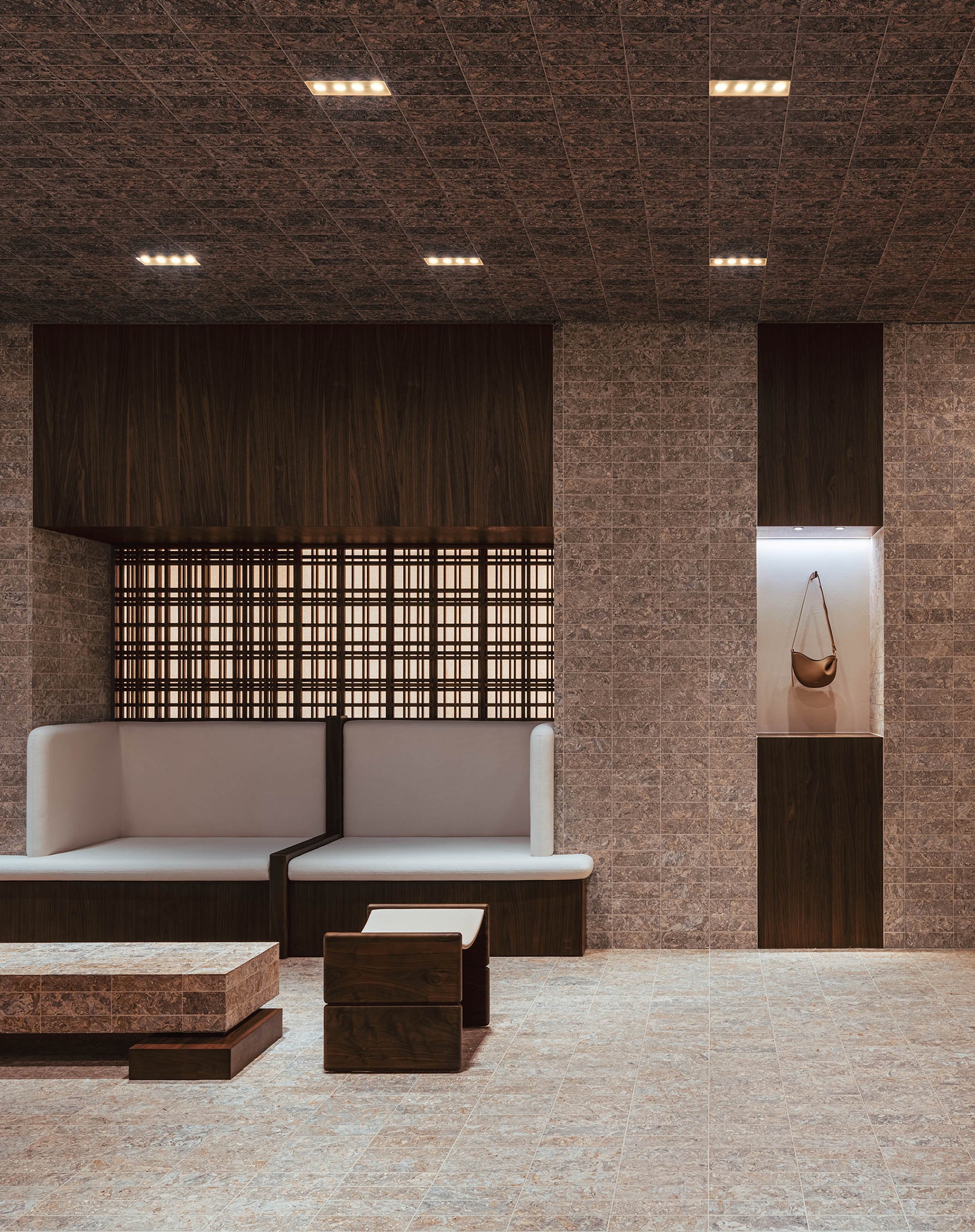 격자 문양으로 짜여진 호두나무 목재 프레임이 공간을 나누며, 가죽과 선지(Xuan Paper)와 어우러집니다. 12톤의 가죽 자투리가 업사이클링되어 압축 가죽 벽돌로 재탄생했습니다. 이 혁신적인 소재는 부티크에 자연석 같은 깊은 질감을 부여합니다.