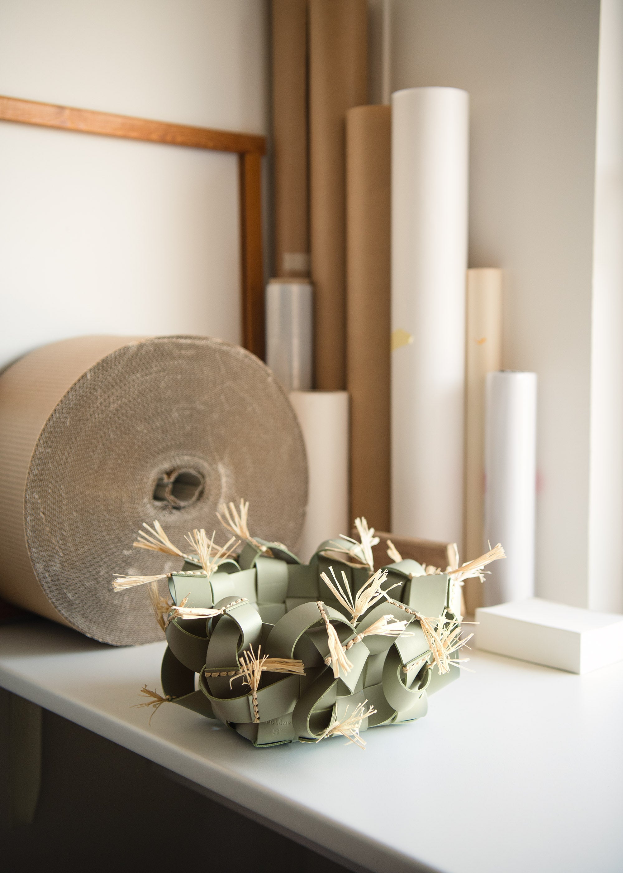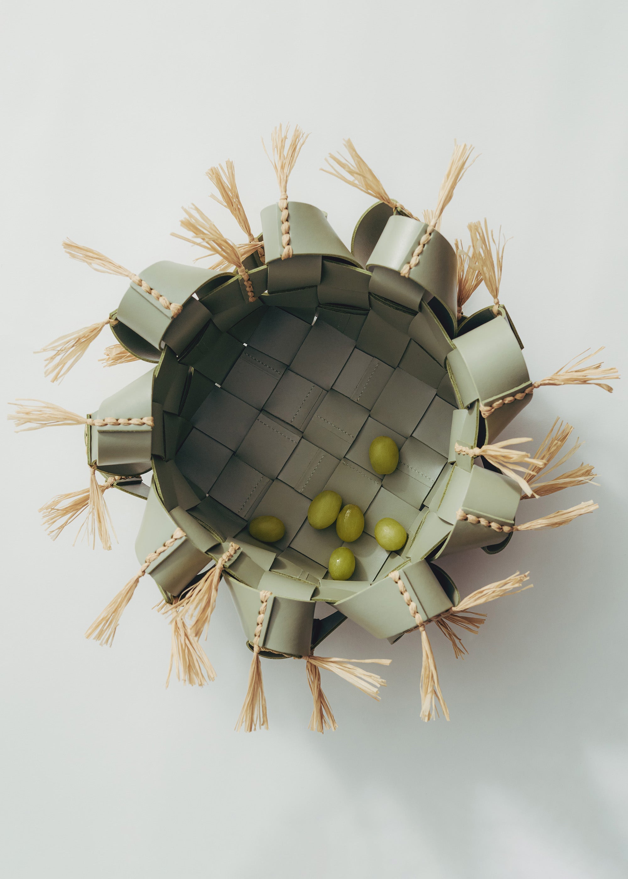 덴마크 디자이너 시아 후르티그칼(Sia Hurtigkarl)과의 협업으로 탄생한 《이니(Yni)》 바구니는 장인 정신이 깃든 ‘짜임’의 미학을 기념합니다. 무한히 이어지는 고리의 유희 속에서, 가죽 자투리들은 손바느질을 통해 천연 라피아로 서로 연결되어 창작의 주인공으로 새롭게 탄생합니다. 시작도 끝도 없는 이 디자인은 업사이클링 컬렉션 플레이(Plèi)가 추구하는 순환성의 철학을 고스란히 담아내고 있습니다.